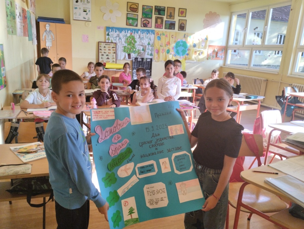 Како би неговали традицију,поштовали жртве предака,истакли важност јединства у заједници ученици трећег разреда кроз анализу песме “Домовина се брани лепотом” истакли су улогу појединца у очувању свог краја,свог завичаја.Упознали смо се са родољубивим песмама и њеним карактеристикама и заједно урадили пано.