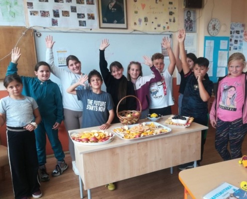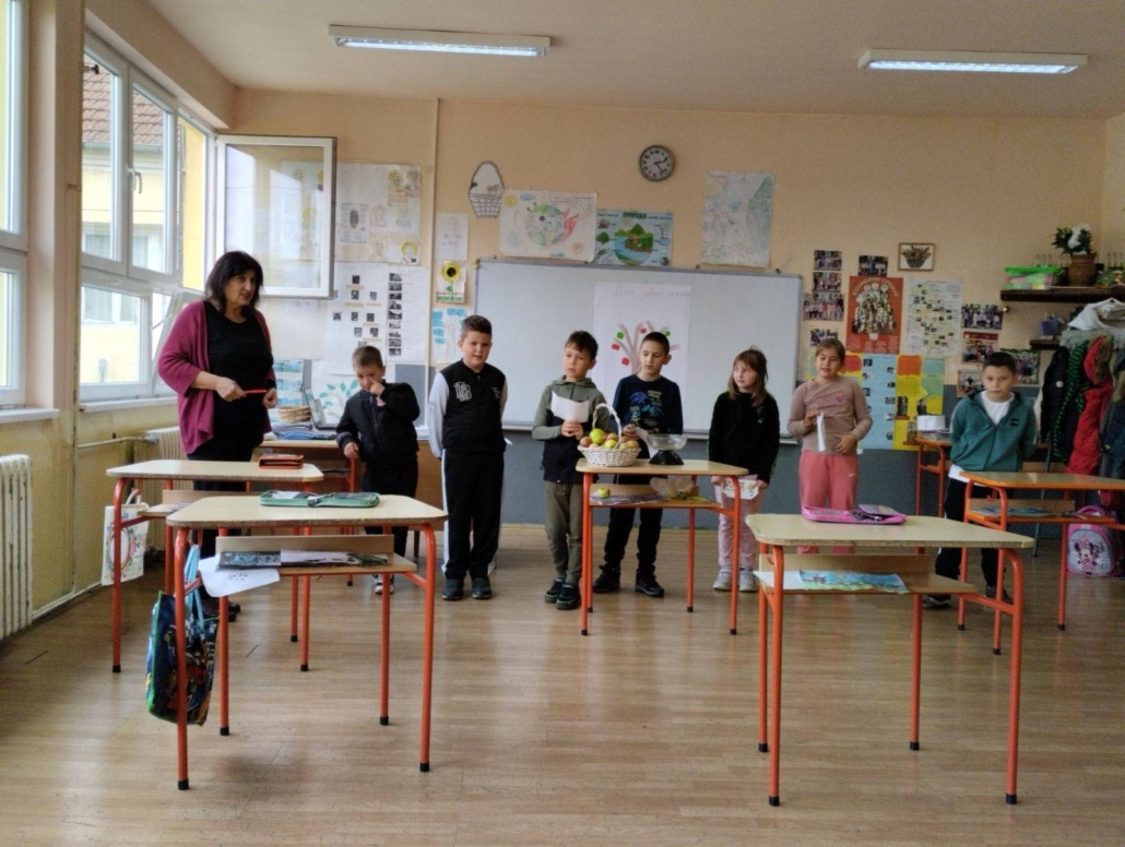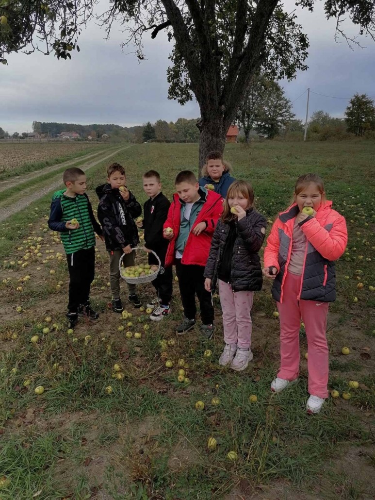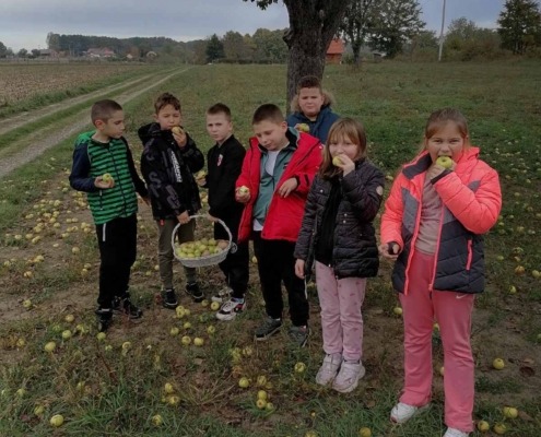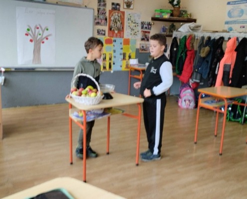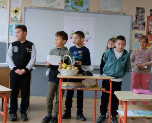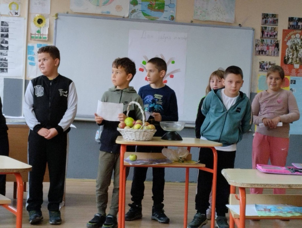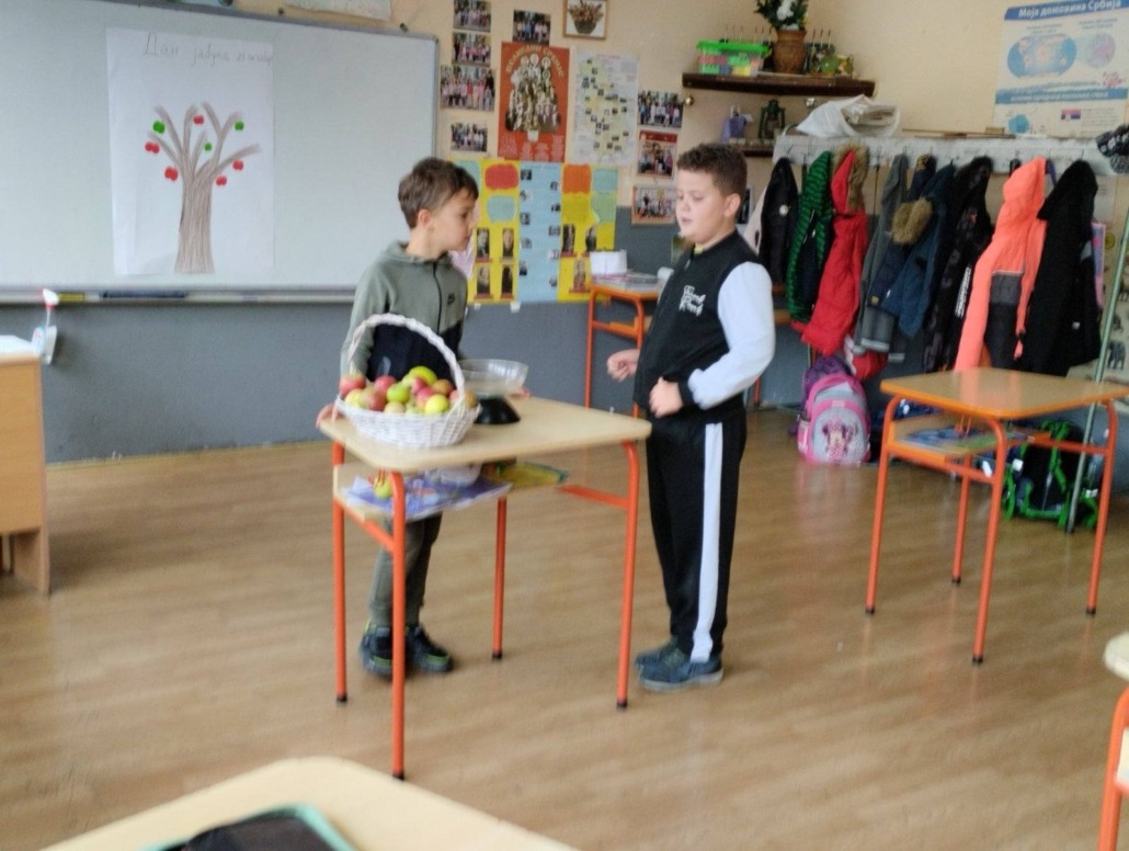 Другаци су прво обишли воћњак у близини школе па пре учења песме на часу Музичке културе анализирали занимљивости из школских новина и одглумели  шале о јабукама.