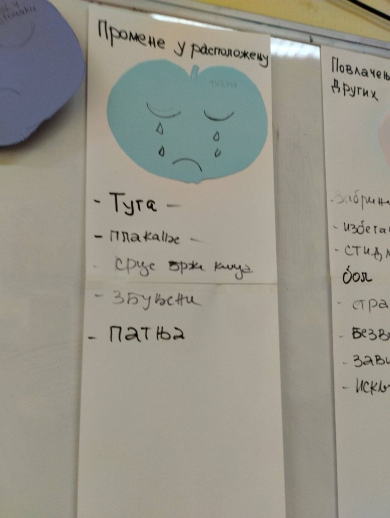 Педагог школе је одржала радионицу на тему -Ментално здравље-,где су ученици анализирали конкретне ситуације и повезали са сликом јабуке која је представљена као лик са одређеним осећањем.